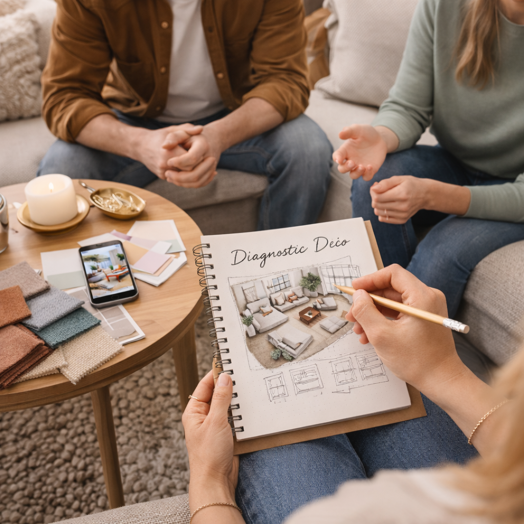 Evaluation de votre espace pour optimiser son style et sa fonctionnalité, échanges sur vos envies, prise de mesures.
