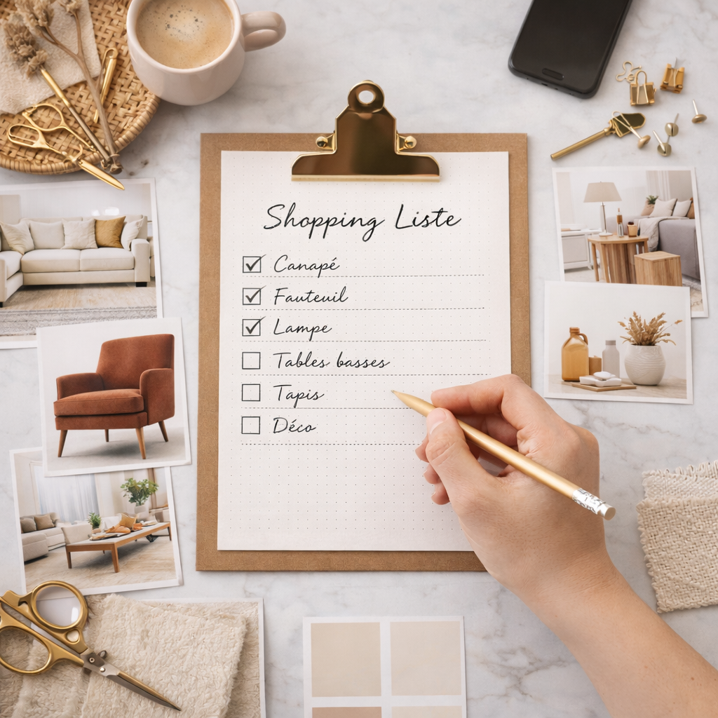 Élaboration d’une liste de shopping sur‑mesure, adaptée à votre projet, pour simplifier la mise en œuvre de votre décoration.